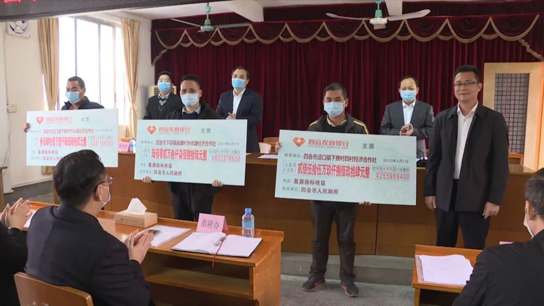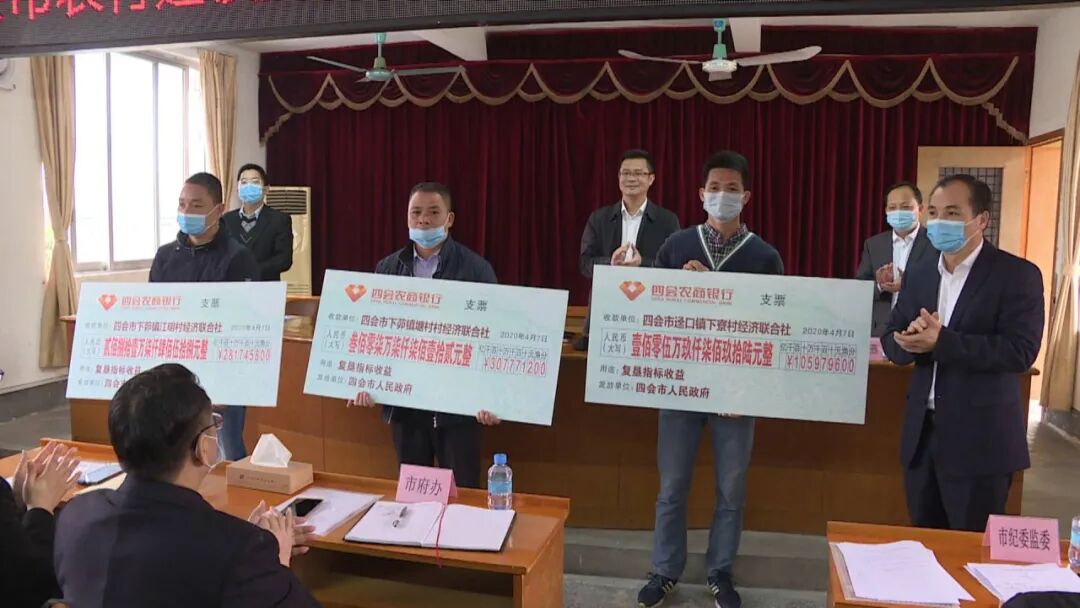 四会市领导为下茆镇南塘村水依塘经济合作社、迳口镇下寮村四村经济合作社、迳口镇下寮村竹头崀经济合作社发放了拆旧复垦指标成交价款共1199.53万元。(来源:四会市融媒体中心供图)