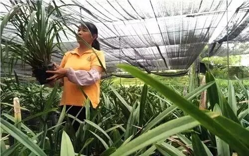 2019年石狗镇引进了肇庆美卉农业发展有限公司、肇庆悦翔农业发展有限公司等农业企业,全年新增兰花种植面积430亩; 建立四会市农村电商创业孵化中心、雅兰芳兰花电商体验馆、万绿兴兰花直播中心。发展“传统销售”+“网络直播”双驱动销售模式,为农户开辟了增收的新路径。 “公司+基地+贫困户”的经营模式 石狗镇积极协助办理农业政银贷,协助9个兰花场申办理特色农业贴息贷款,发放贷款170万元,推动兰花产业发展;着力打造“石狗镇兰花产业扶贫示范基地”,通过采取“公司+基地+贫困户”的经营模式,推行“资金入股得分红、土地流转得田租、基地务工得报酬、托管经营得实惠、免费培训得技能、带动种植得收益”等六种利益联结机制,带动贫困户增收致富,推动石狗镇兰花产业发展。 “肇庆市农村致富带头人”莫五妹——石狗镇兰花种植基地走出的致富女能手。(来源:四会市融媒体中心供图) 下一步,四会市石狗镇将继续发展“一村一品、一镇一业”,做大做强兰花产业,擦亮石狗名片,同时大力推动石狗镇乡村旅游发展,借助石狗镇程村(兰花基地)成为首批广东省乡村旅游精品线路旅游点契机,结合兰花特色,打造乡村旅游示范点。