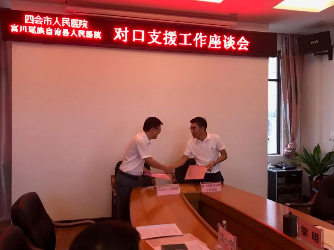 两地县级医院联合召开了对口支援座谈会,并签订了结对帮扶框架协议。四会市人民医院结合实际,充分利用自身人才资源优势,制定了对口支援工作计划、工作制度,明确了每年选派医德医风好、敬业精神强、业务水平高、老年资主治医师以上并具备一定指导带教能力的医务人员轮流对口帮扶富川县人民医院,指导和协助开展医疗救援工作,解决临床诊治的疑难问题,提升富川医疗技术水平。