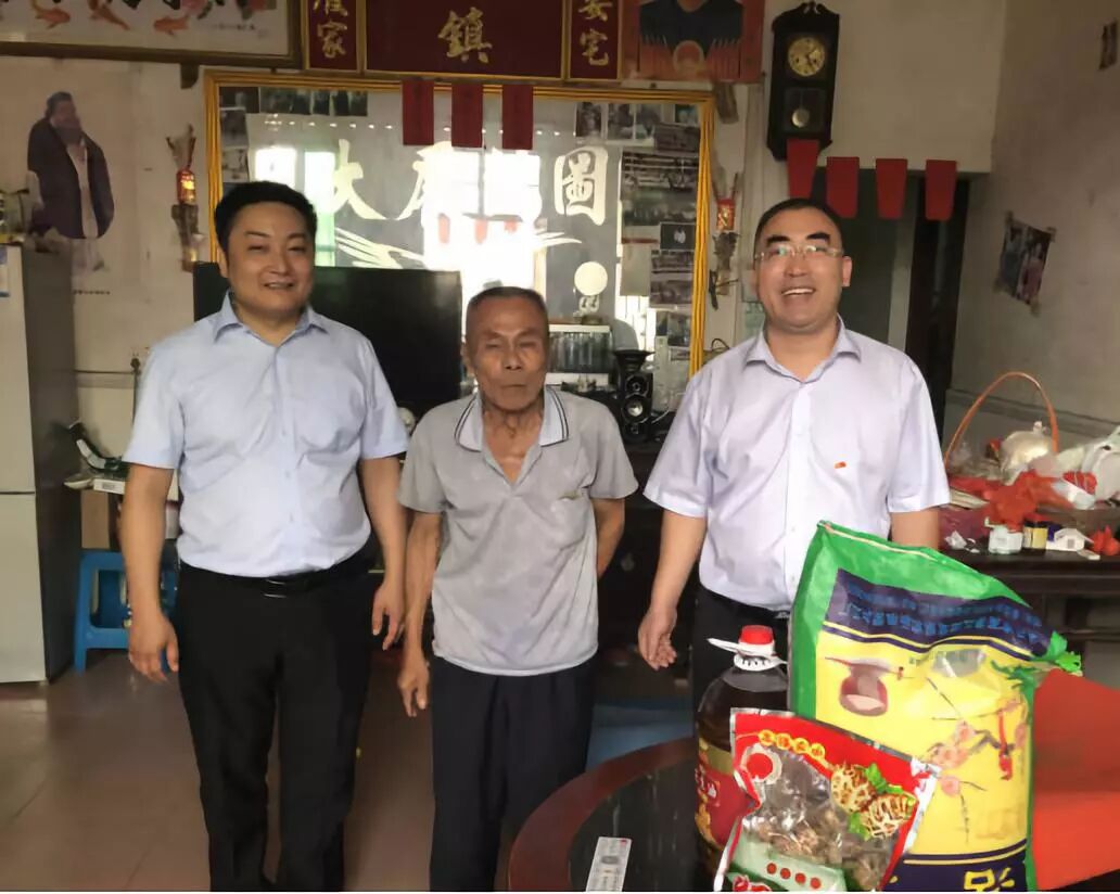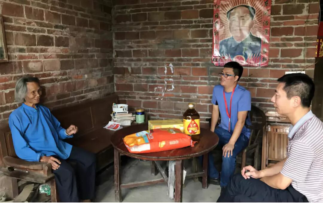 四会邮储银行行长李志富(右一)、副行长杨灿波(左一)到贫困户梁家芳家中了解贫困户生产生活困难,初步制定下一步帮扶措施,送上慰问品。(来源:四会市精准扶贫驻怀集县永固镇工作组供图)