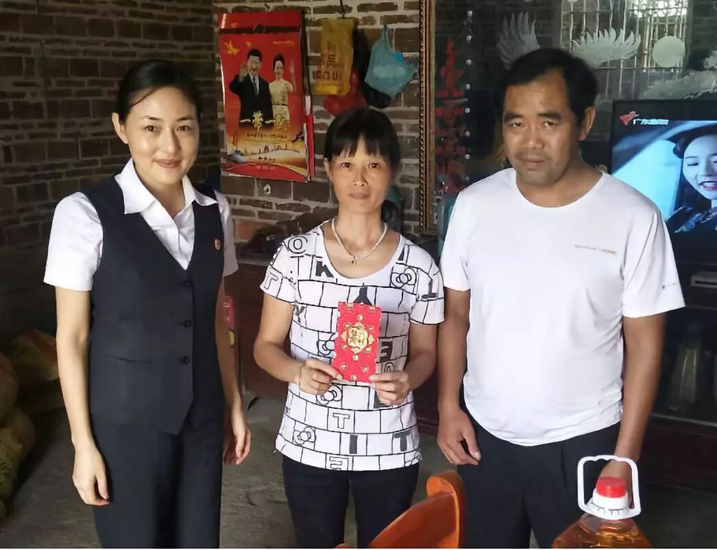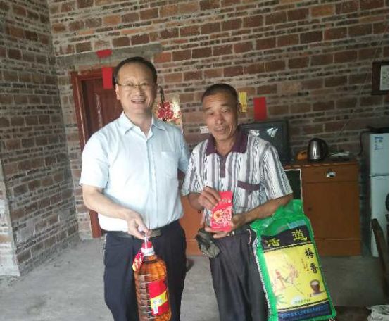 工商银行四会支行行长曾健敏(右一)给对口帮扶贫困户送上慰问品和慰问金。(来源:四会市精准扶贫驻怀集县永固镇工作组供图)