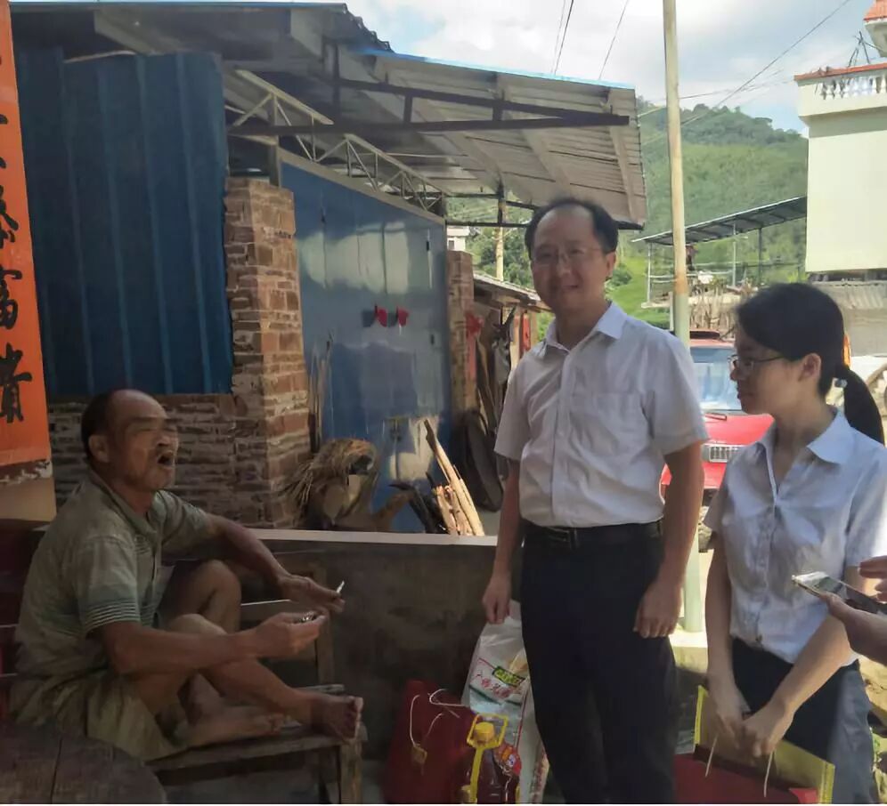 广发银行四会支行副行长张华锋(左一)到对口帮扶贫困户家中了解贫困户生产生活困难,初步制定下一步帮扶措施,送上慰问品和慰问金。(来源:四会市精准扶贫驻怀集县永固镇工作组供图)