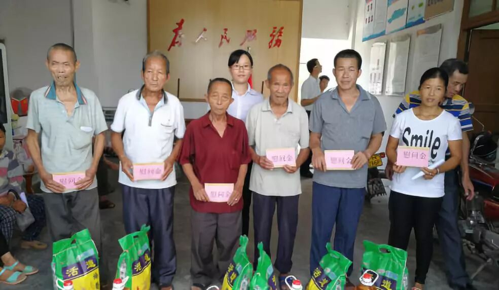 中国银行四会支行副行长谢文婕(左四)给对口帮扶贫困户送上慰问品和慰问金。(来源:四会市精准扶贫驻怀集县永固镇工作组供图)