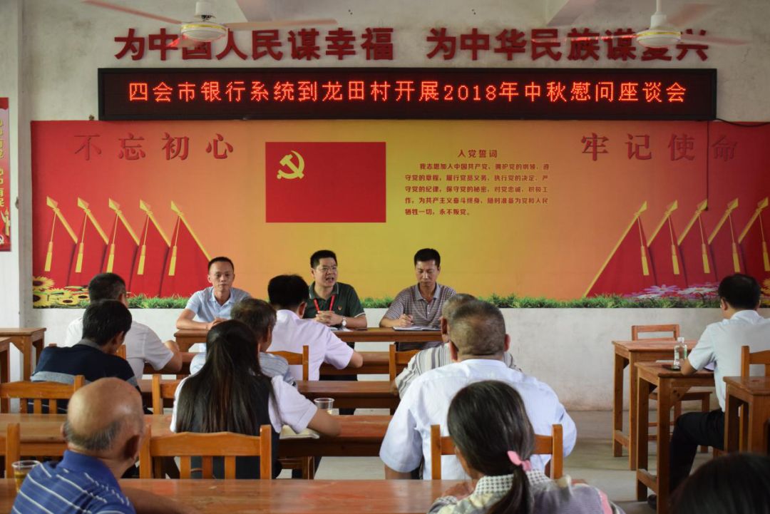 2018年9月13日,中秋佳节来临之际,在四会市驻永固镇扶贫工作组和中国人民银行四会支行的组织下,四会农商银行等8家银行单位一同到访怀集县永固镇龙田村开展扶贫工作推进会暨中秋慰问活动。