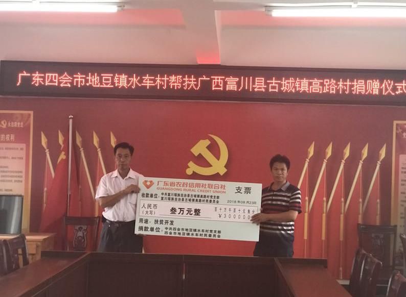 水车村向高路村捐赠三万元帮扶资金。(来源:四会驻广西富川扶贫协作工作组供图)