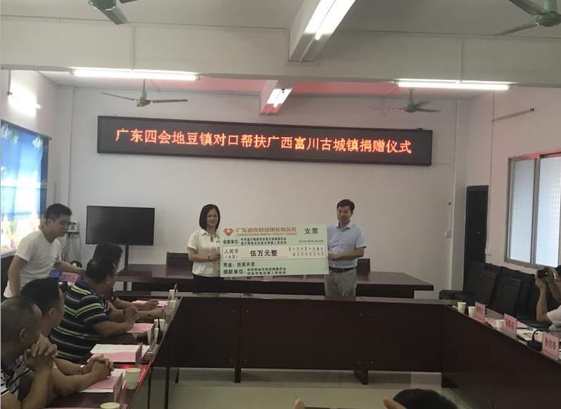 地豆镇向古城镇捐赠五万元帮扶资金。(来源:四会驻广西富川扶贫协作工作组供图)