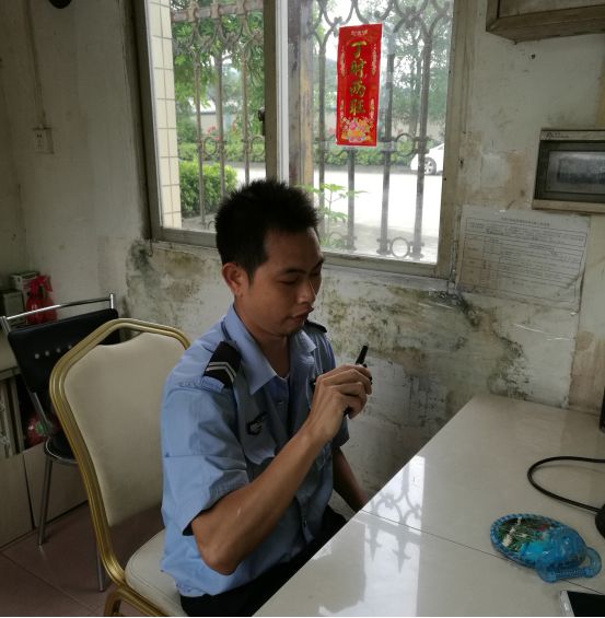 龙甫金属循环基地的对口贫困户袁兆龙通过龙甫金属循环基地的介绍,到四会市德诚物业管理有限公司做保安工作。(来源:四会市精准扶贫驻怀集县永固镇工作组供图)