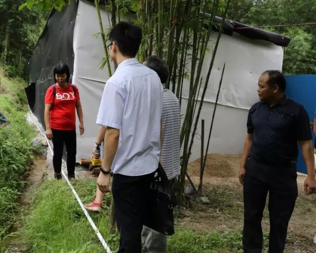 四会市总工会扶贫工作组现场查看鹅棚周边排水沟建设情况。(来源:四会市广播电视台供图)