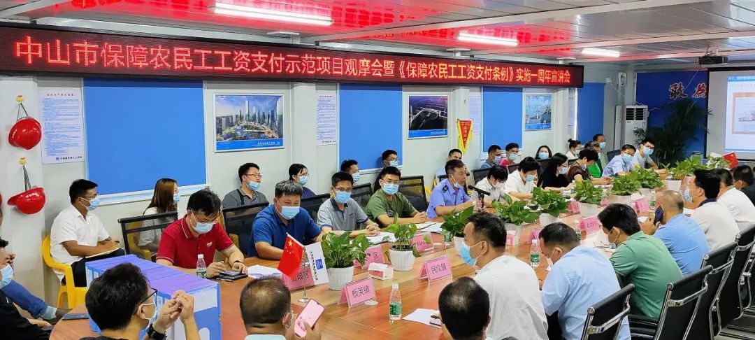 5月21日,在我国《保障农民工工资支付条例》发布实施一周年之际,中山市保障农民工工资支付示范项目观摩会暨《保障农民工工资支付条例》实施一周年宣讲会在火炬区召开,全市各镇街人社部门和建筑单位企业代表到示范工地项目参观交流。
