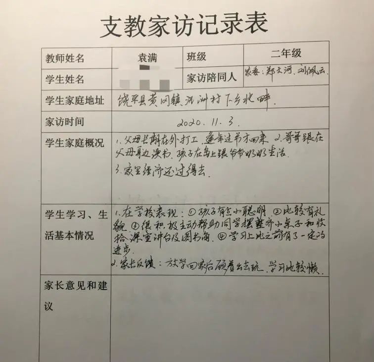 2020年11月,在家委会的帮助下,袁满对全班20名学生的家庭开展了普访,了解学生原生家庭的经济来源、家庭关系等情况,为学生家长分析如何同时兼顾孩子的教育与自己的工作生活。“家访一个学生大概需要一个多小时,从晚上七点多开始,一般家访三个家庭,就差不多十一点多了。”袁满说,“当地习惯用茶招呼客人,我有时家访完回到宿舍都是睡不着的。”
