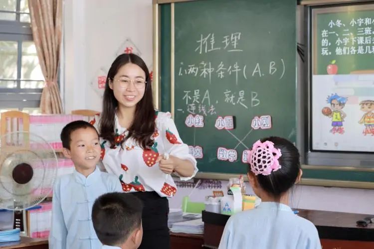 “小冬、小宇和小伟三人分别在一、二、三班。小冬是三班的,小宇下课后去二班找小伟玩。他们各是几班的?小沐(化名)老师,你想要提问谁?”5月14日,在潮州市饶平县汛洲小学二年级教室里,来自中山火炬区第三小学的数学老师高健韵挑选学生代表作为“小老师”,结合针对推理教学设计的多个游戏,一步一步地带动起20余名一、二年级学生举手发言。