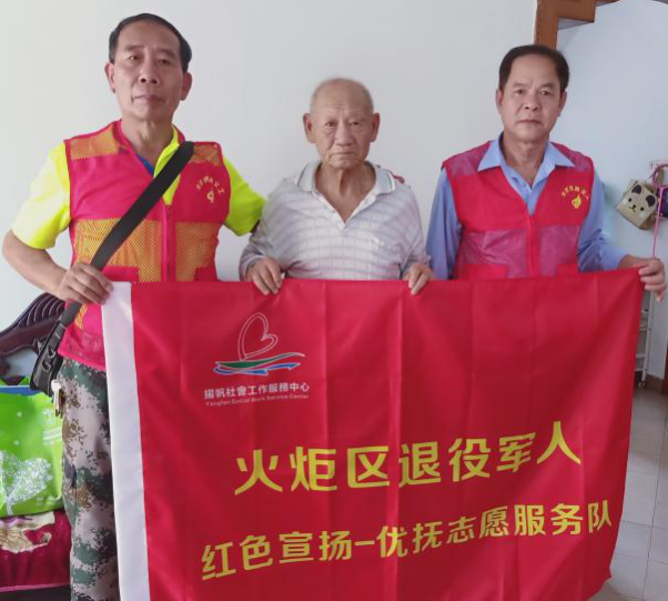 2019年,火炬区退役军人服务中心成立了“红色宣扬-火炬优抚志愿服务队”,以火炬区80岁以上高龄、独居、空巢和困难等优抚对象为服务群体,开展新春送暖、端午慰问、中秋关爱、重阳送暖等节日性关怀探访活动。服务队成立至今,共服务高龄优抚对象212人次,并为一名高龄孤寡优抚对象解决了安装遮雨棚难题,获得服务的对象好评。