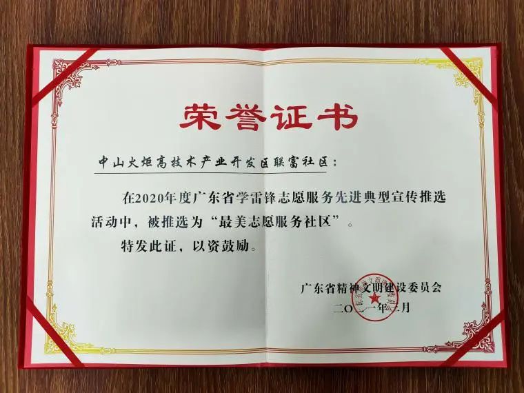 日前,广东省组织开展了2020年度学雷锋志愿服务先进典型宣传推选活动,经省文明办组织评审,广东中山火炬区联富社区获评广东省“最美志愿服务社区”,全省仅30个社区获此殊荣。