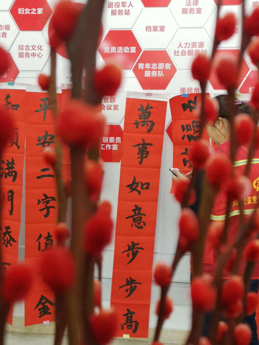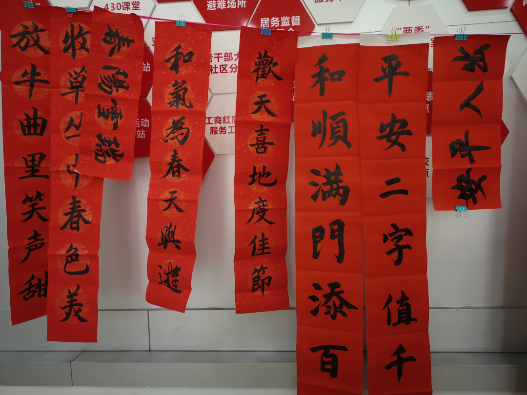 为弘扬传统文化,推进文化进基层惠万家,2月3日下午,“情满社区 春联送万家”主题活动在新装修的“同心园”党群服务中心顺利举行,邀请了书法爱好者挥毫泼墨,现场为群众免费书写春联,活动吸引了众多居民前来。一张张精美的“福”字,一行行遒劲有力的新春祝福跃然纸上,一幅幅饱含心意的对联烘托出了喜气洋洋节日的氛围。