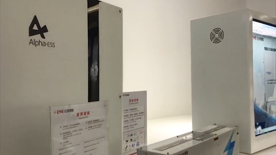 工作人员向记者介绍储能系统的用途。储能系统就是可以把电装进盒子里,带着走,有工业用的,也有家庭用的不同型号,可以循环使用2000多次,大的存2000度电,小的存五六度电。