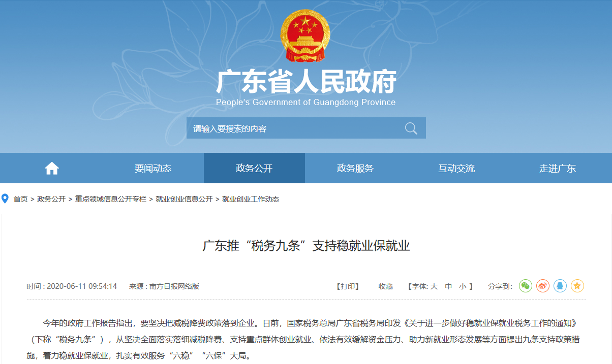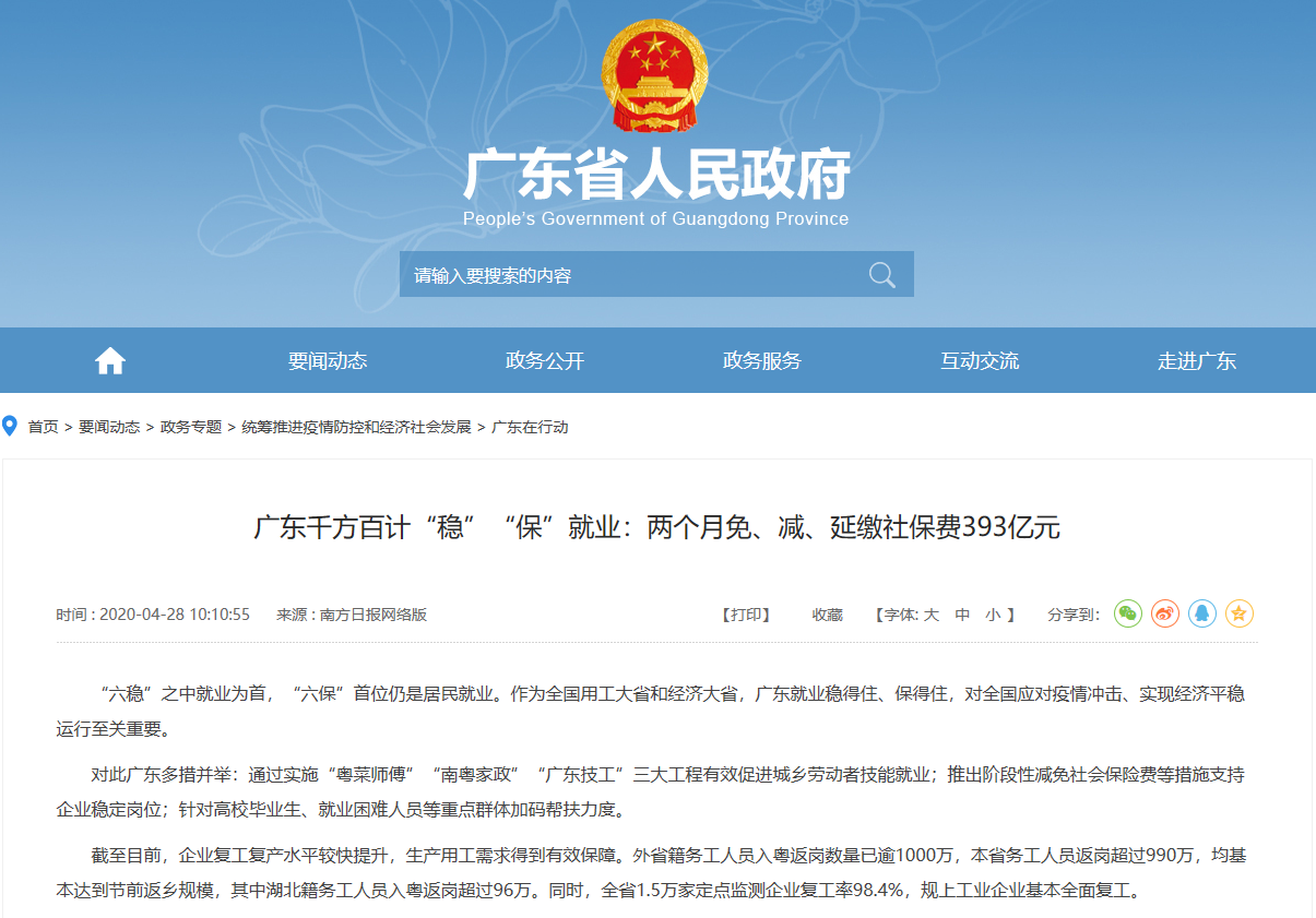 目前,广东已出台促进外贸稳定的20条措施、2.0版“促进就业九条”、“制造业十九条”、减税降费等若干政策措施,这些措施组合拳都有力推动广东做好“六稳”工作,落实“六保”任务。